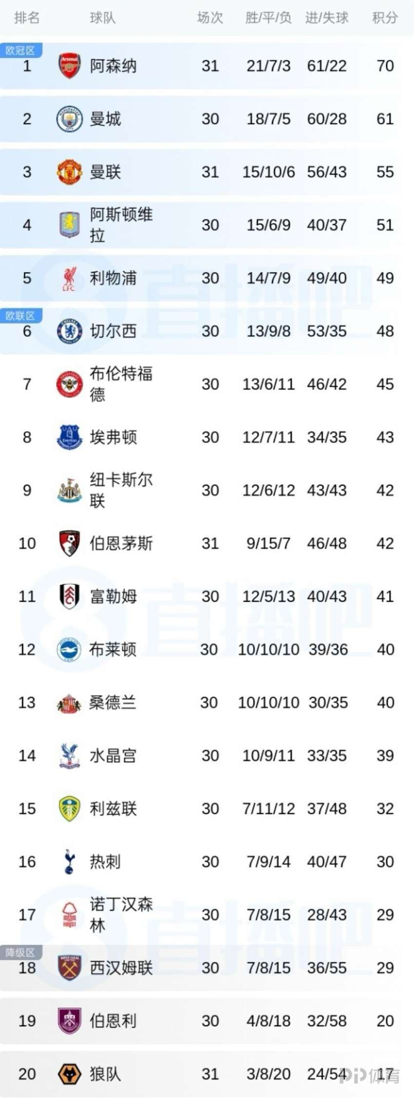 英超第31轮,曼联2-2战平伯恩茅斯。曼联先赛以55分排名第三,领先维拉4分、领先第六的切尔西7分。伯恩茅斯42分排名第十。
