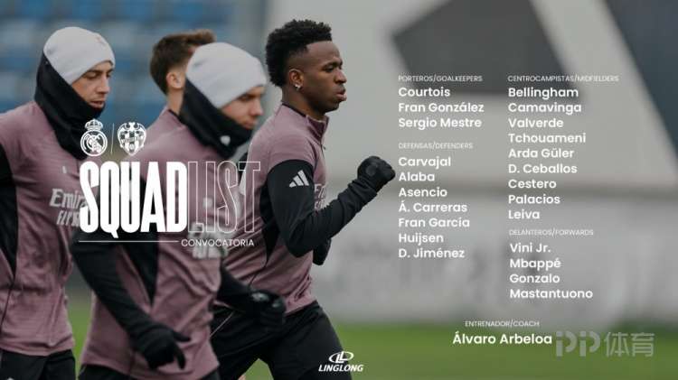 北京时间1月17日21:00,2025-26赛季西甲联赛第20轮,皇马将坐镇主场迎战莱万特。赛前,皇马官方公布球队大名单,姆巴佩在列。