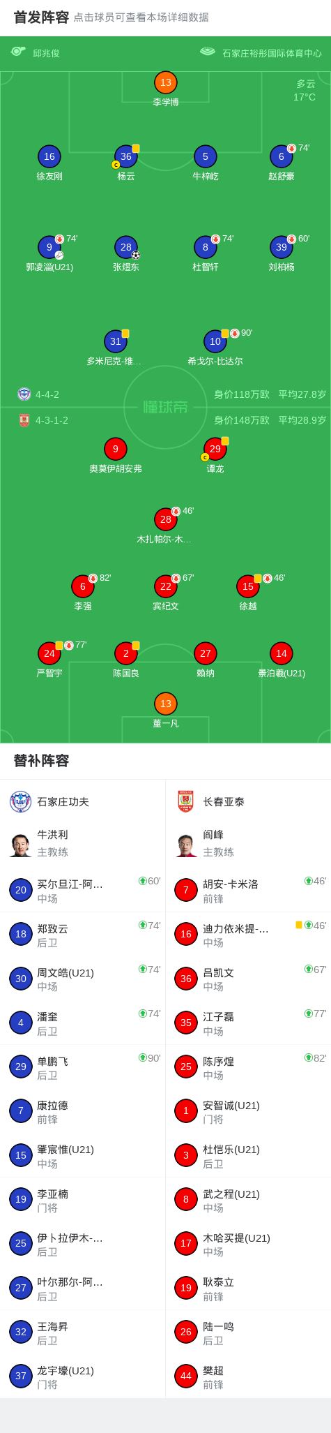 北京时间3月21日中国足球甲级联赛 联赛 第2轮,石家庄功夫主场对阵长春亚泰。石家庄功夫张煜东破门。最终比分石家庄功夫 1-0 长春亚泰。