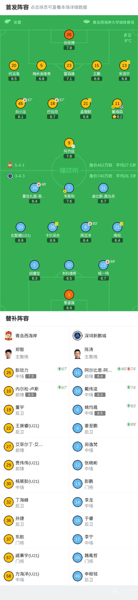 北京时间3月21日中国足球超级联赛第3轮,青岛西海岸主场对阵深圳新鹏城。上半场刘世博多次神扑,力保球门不失;戴维森凌空抽射击中横梁。下半场阿齐兹助攻戴维森破门。最终比分青岛西海岸 1-0 深圳新鹏城。