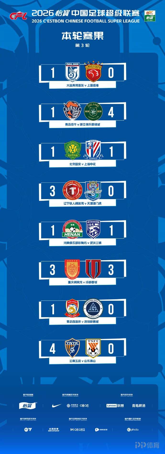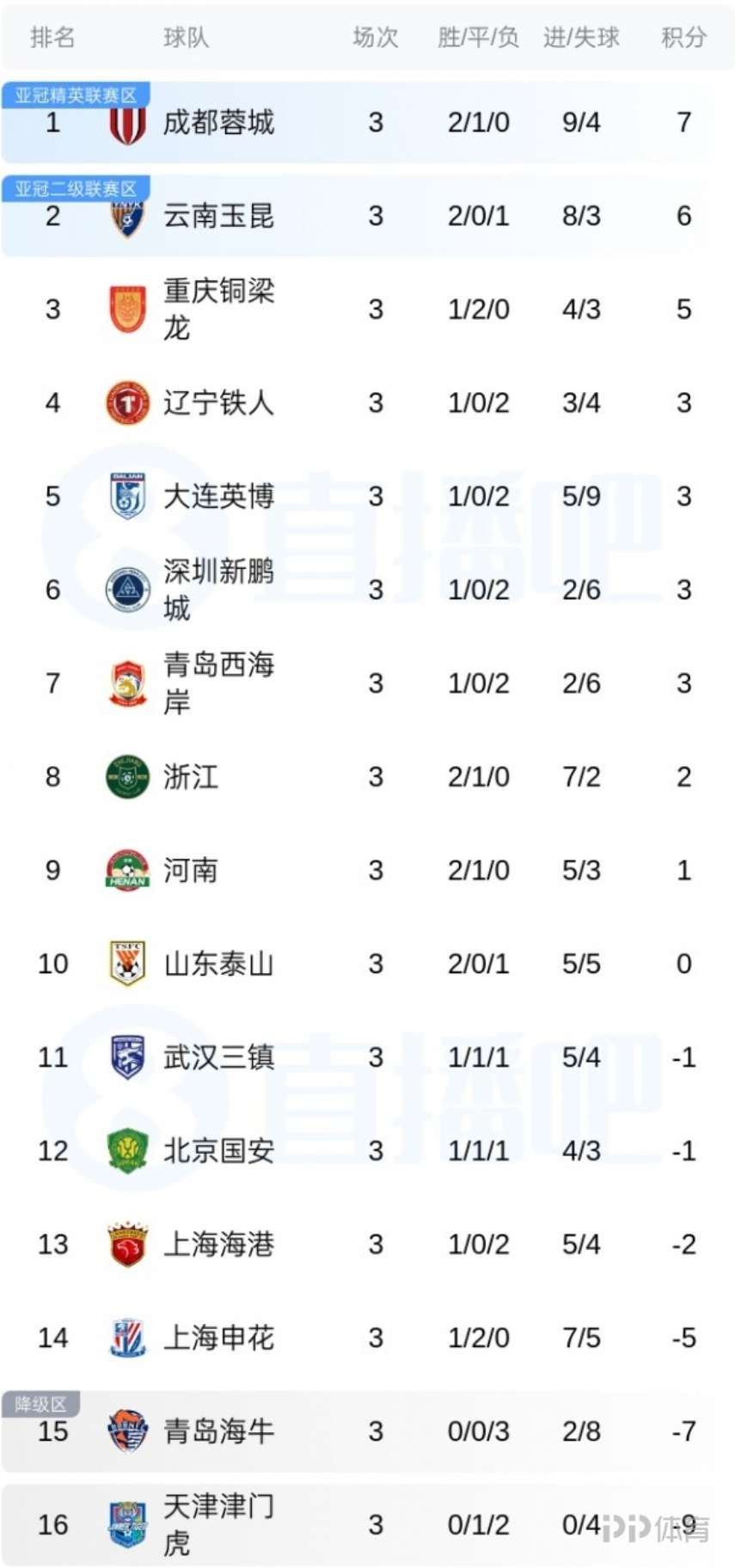 中超第3轮比赛全部结束,积分榜上,成都蓉城、云南玉昆、重庆铜梁龙三支西南球队前三,浙江、河南积分“回正”分别第8、9,泰山0分第10,武汉三镇、北京国安、上海海港、上海申花、青岛海牛、天津津门虎仍负分。