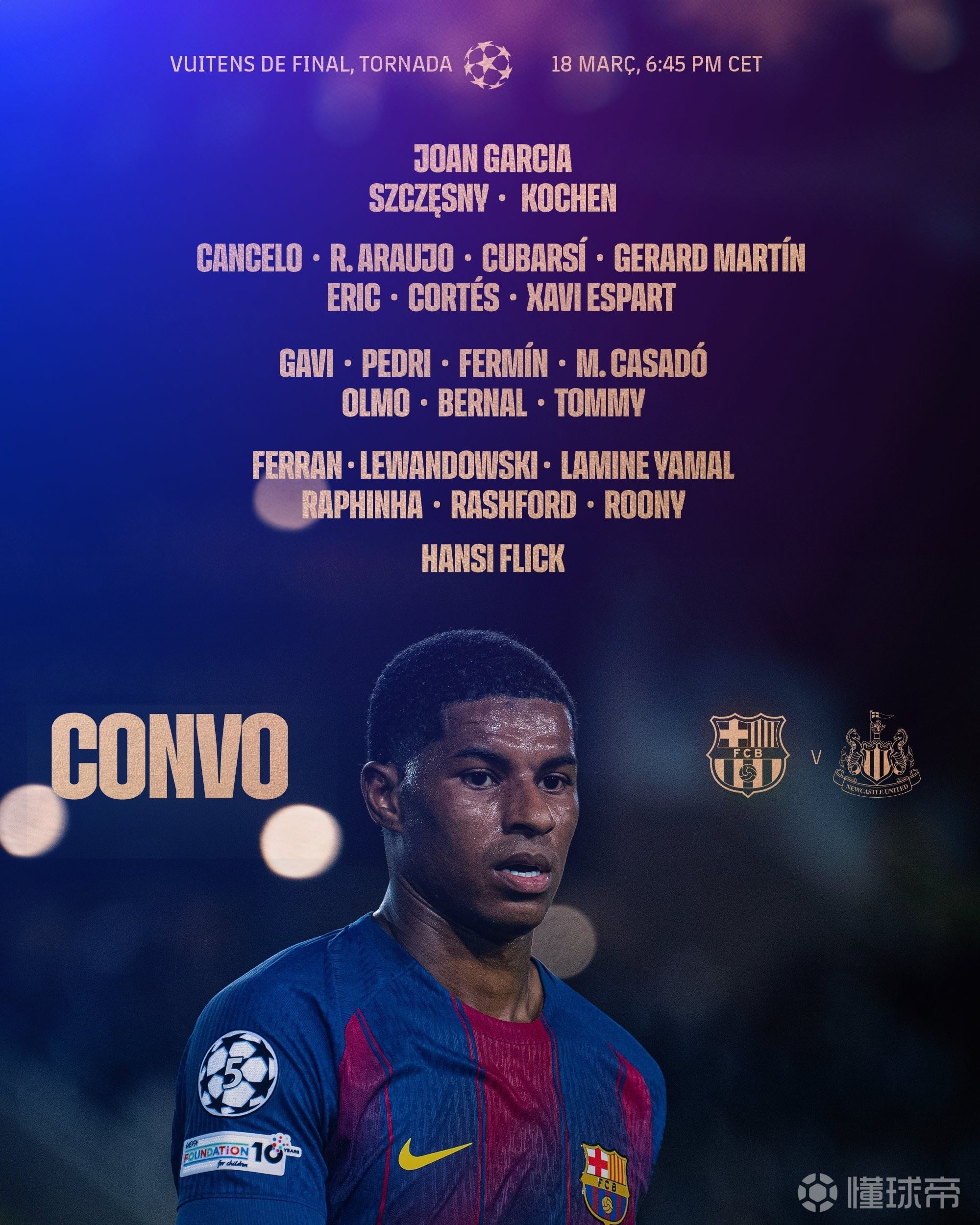 北京时间3月19日凌晨1点45分,欧冠1/8决赛次回合,巴萨将在主场迎战纽卡。赛前,巴萨官方公布了球队本场比赛的大名单。