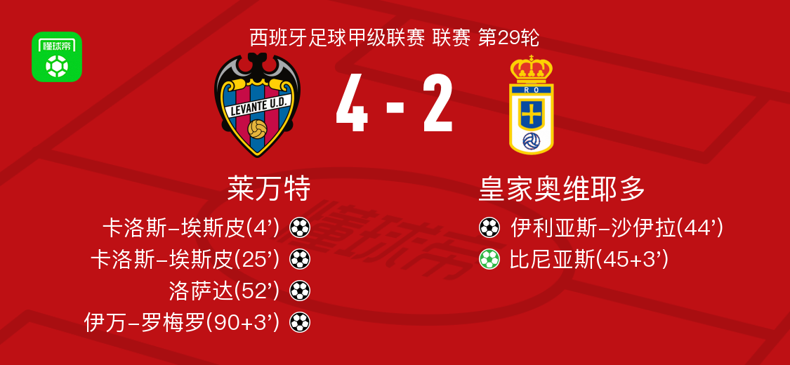 北京时间3月22日西班牙足球甲级联赛 联赛 第29轮,莱万特主场对阵皇家奥维耶多。莱万特卡洛斯-埃斯皮梅开二度,洛萨达破门,伊万-罗梅罗破门。皇家奥维耶多伊利亚斯-沙伊拉破门,比尼亚斯破门。最终比分莱万特 4-2 皇家奥维耶多。