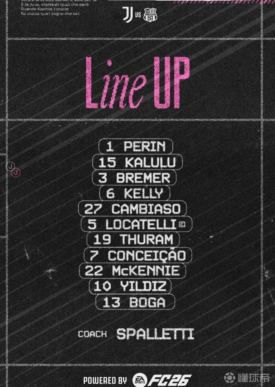 尤文首发:1-佩林、27-坎比亚索、15-卡卢卢、6-凯利、3-布雷默、19-图拉姆、22-麦肯尼、5-洛卡特利、7-孔塞桑、10-伊尔迪兹、13-博加
