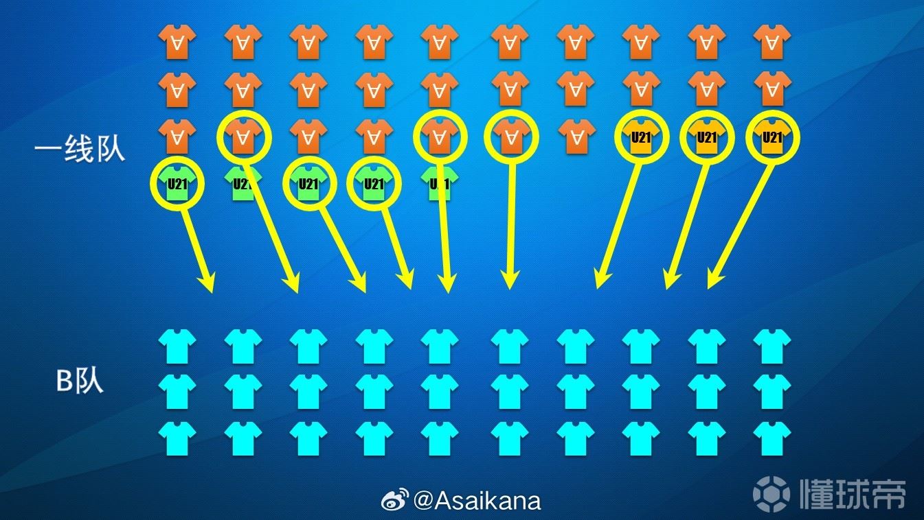 二者虽有交集,但并无强制绑定关系。B名单中的球员不一定进入B队,A名单中的U21球员同样可以进入B队。