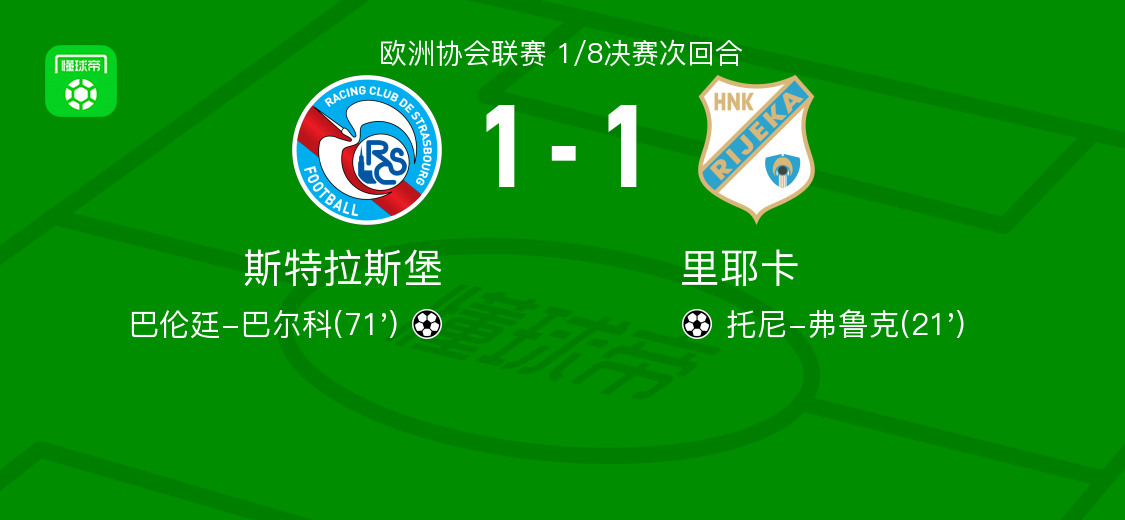 北京时间3月20日欧洲协会联赛 1/8决赛次回合,斯特拉斯堡对阵里耶卡。斯特拉斯堡巴伦廷-巴尔科破门。里耶卡托尼-弗鲁克破门。最终比分斯特拉斯堡 1-1 里耶卡。两回合总比分斯特拉斯堡3-2里耶卡。