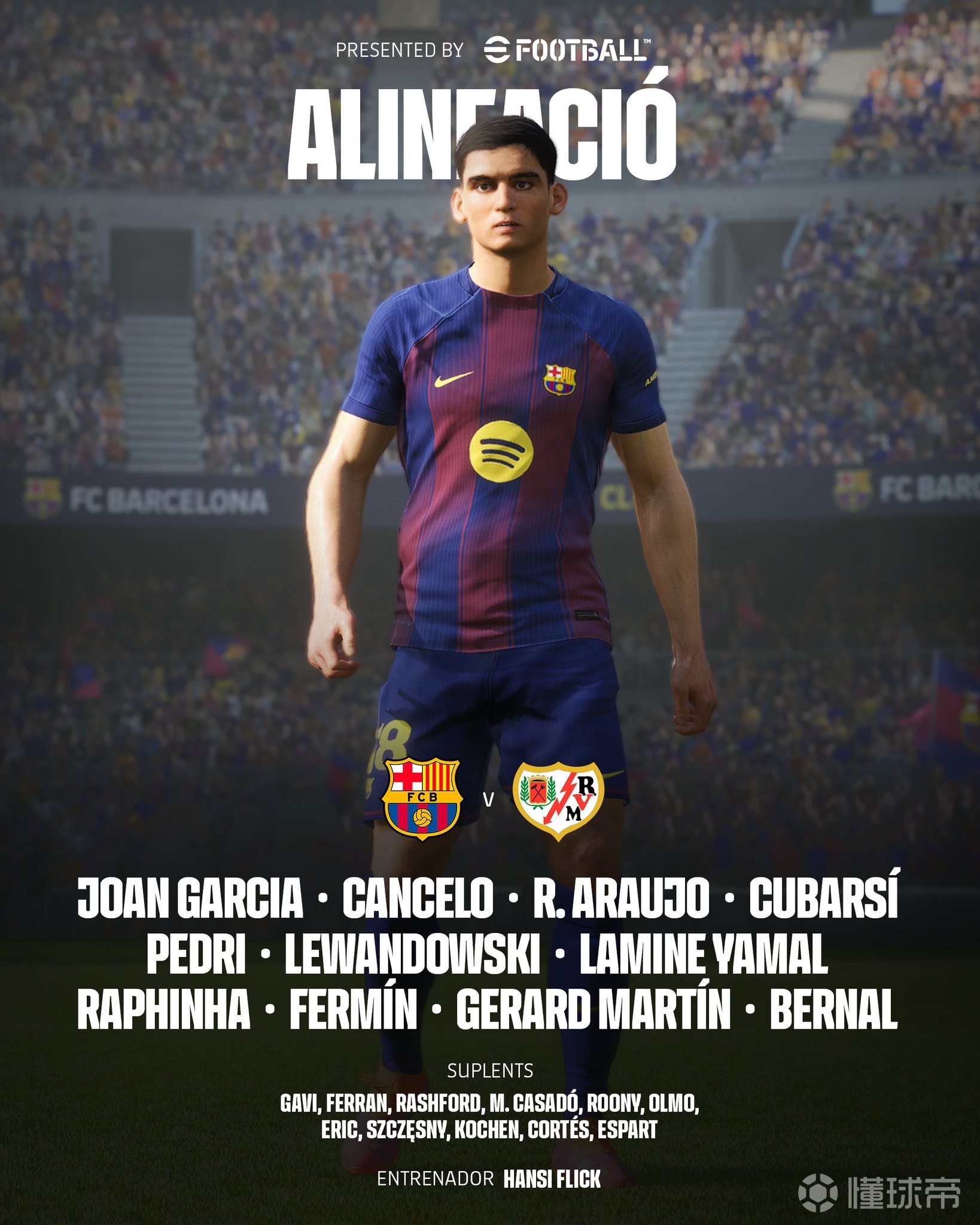 巴塞罗那首发:13-霍安-加西亚、2-坎塞洛、4-阿劳霍、5-库巴西、18-赫拉德-马丁、8-佩德里、22-马克-贝尔纳尔、16-费尔明-洛佩斯、10-亚马尔、11-拉菲尼亚、9-莱万多夫斯基