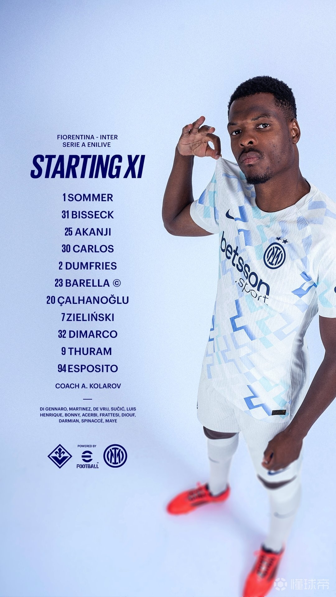 国际米兰首发:1-索默、31-比塞克、25-阿坎吉、30-卡洛斯-奥古斯托、2-邓弗里斯、23-巴雷拉、20-恰尔汗奥卢、7-泽林斯基、32-迪马尔科、94-皮奥-埃斯波西托、9-马库斯-图拉姆