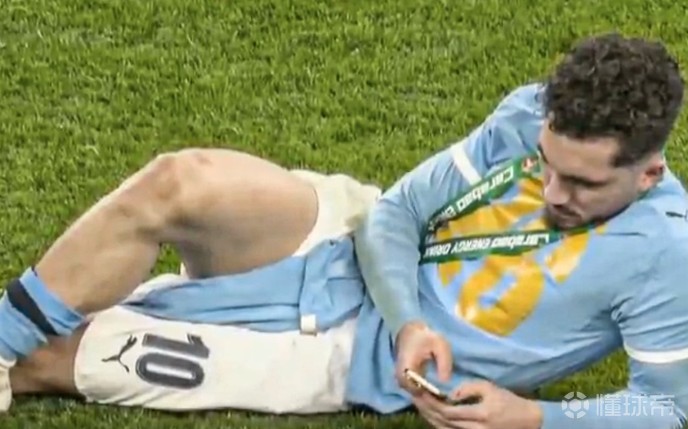 在今天凌晨进行的英联杯决赛中,曼城2-0击败阿森纳夺冠,赛后的照片可以看到,在颁奖典礼结束后,谢尔基在球场内躺着玩手机。
