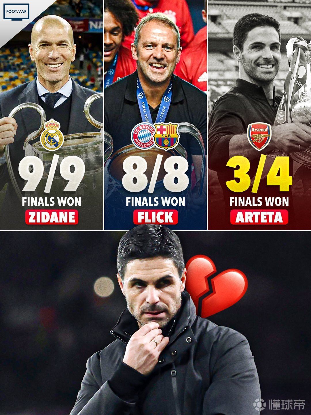 阿尔特塔首次输掉决赛,无缘追赶齐达内与弗里克的纪录