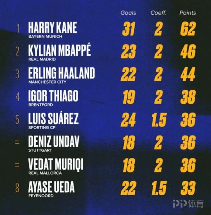 以下为欧洲金靴积分榜排行: