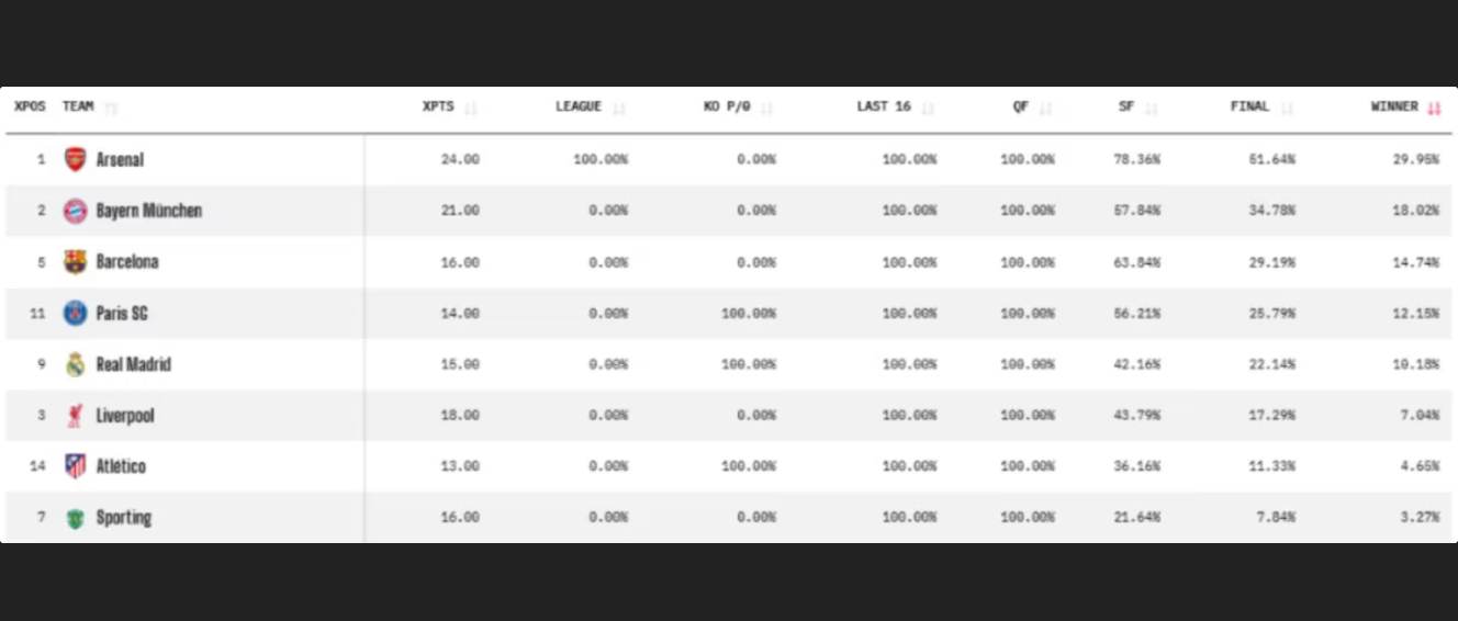 根据Opta的数据模型,目前最大的夺冠热门是阿森纳。枪手不仅在联赛阶段排名第一,还顺利淘汰了勒沃库森。