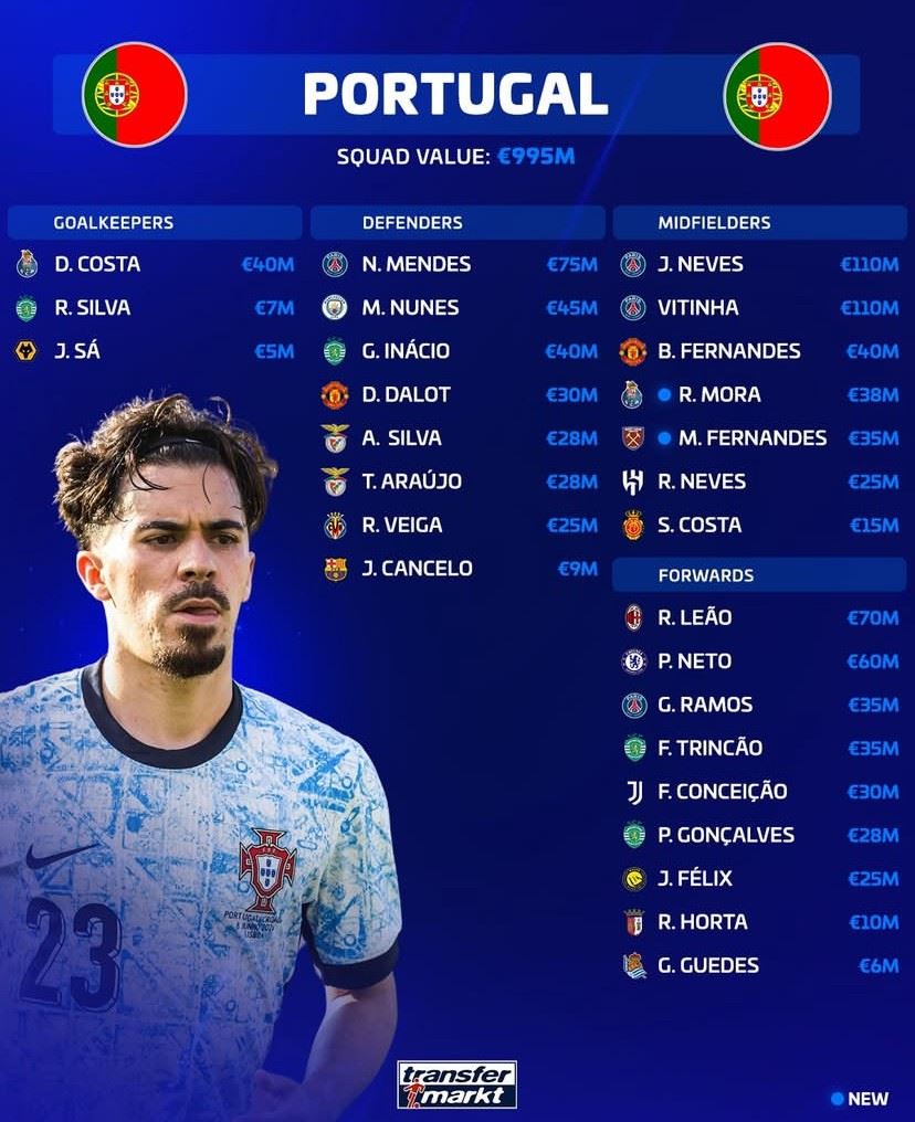 北京时间3月21日,在葡萄牙国家队公布新一期大名单之后,德转列出了葡萄牙队此次27人大名单的身价排行榜,巴黎圣日耳曼中场双星若昂-内维斯和维蒂尼亚同以1.1亿欧元并列第一,努诺-门德斯7500万欧元第三,莱奥7000万欧元第四。