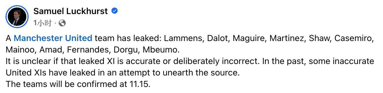 Samuel Luckhurst在公布这份首发时表示,目前尚不清楚这份泄露的首发名单是否正确。过去,曾有一些不正确的曼联首发名单被提前泄露出来,目的是找出其来源。