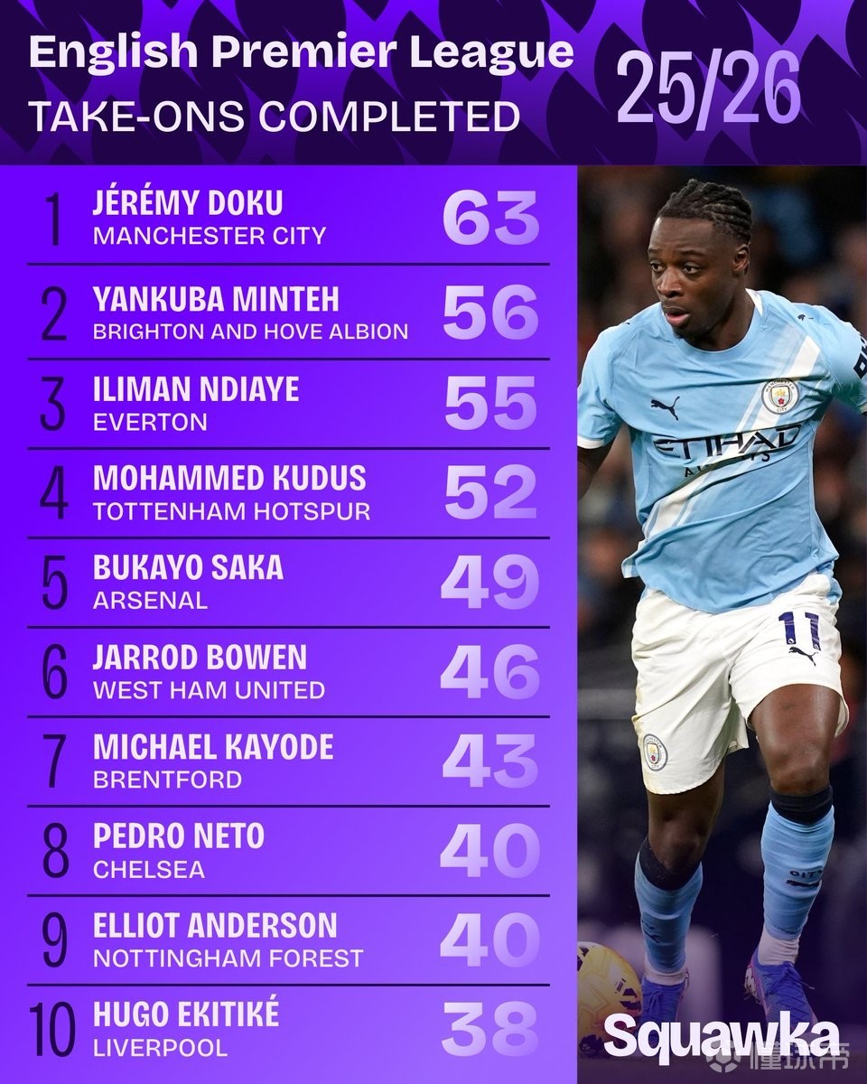 北京时间3月24日,知名数据机构Squawka统计出了本赛季至今英超成功过人次数最多的10名球员,多库63次第1,扬库巴-明特56次第2,伊利曼-恩迪亚耶55次第3,库杜斯、萨卡、佩德罗-内托和埃基蒂克上榜。