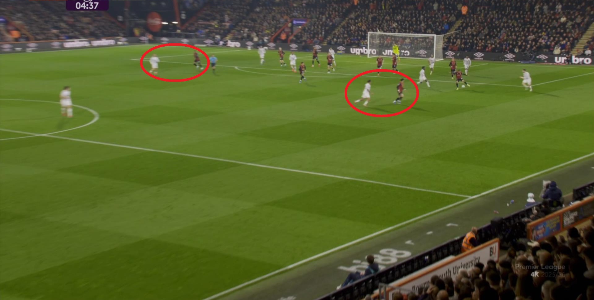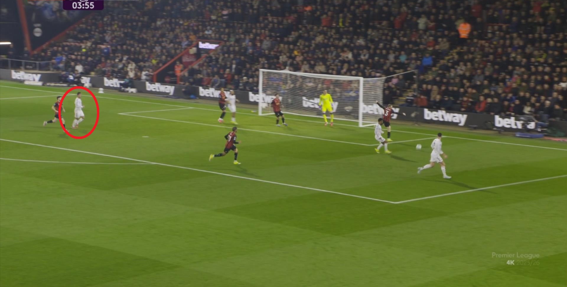 这个时候,曼联想要打出优势,就需要找其中还能勉力维持的点位,这个点位就是库尼亚,一方面他的确是比较全面,所以身体撑得住技术的基本发挥,另一方面就是他对位的伯恩茅斯右后卫阿莱士-希门尼斯比较弱,所以在这个一对一里,曼联可以打出优势,从而形成局势上的平衡,甚至是反超: