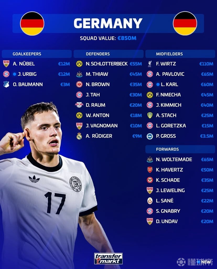 北京时间3月20日,在德国国家队公布新一期大名单之后,德转列出了德国队此次26人大名单的身价排行榜,维尔茨1.1亿欧元第一,亚历山大-帕夫洛维奇和沃尔特马德6500万欧元并列第二。