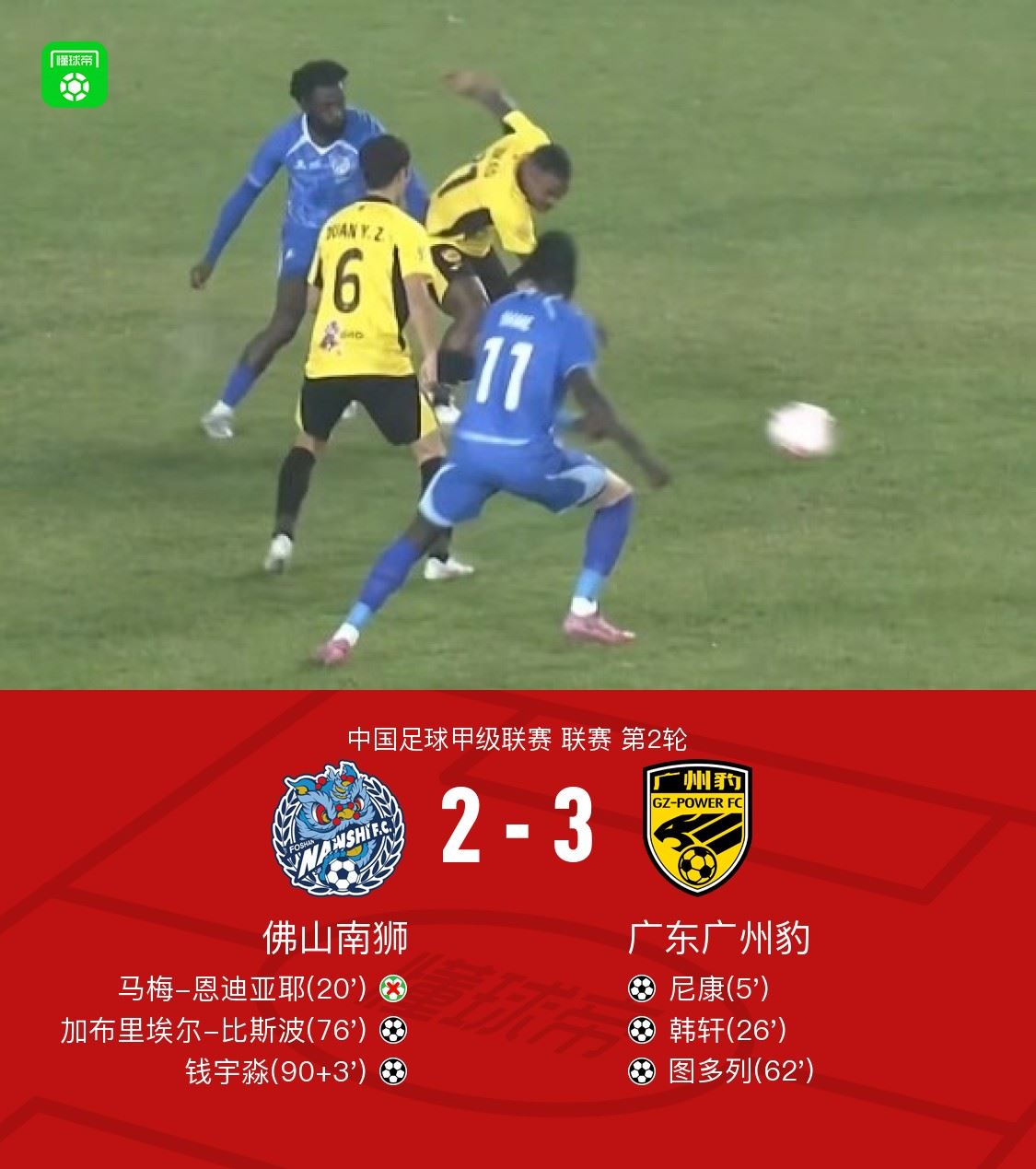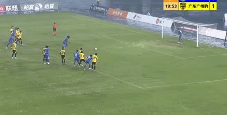 第5分钟,尼康外围起脚劲射破门,广东广州豹1-0佛山南狮