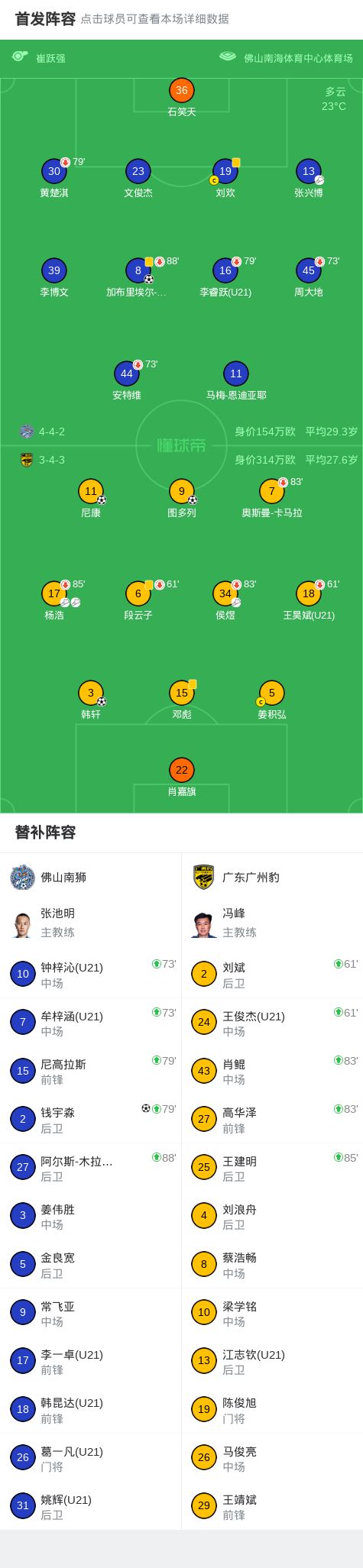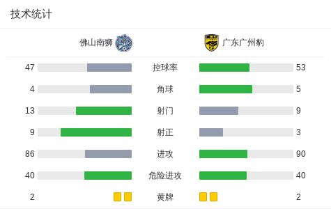 北京时间3月21日中国足球甲级联赛 联赛 第2轮,佛山南狮主场对阵广东广州豹。佛山南狮加布里埃尔-比斯波破门,钱宇淼破门。广东广州豹尼康破门,韩轩破门,图多列破门。最终比分佛山南狮 2-3 广东广州豹。
