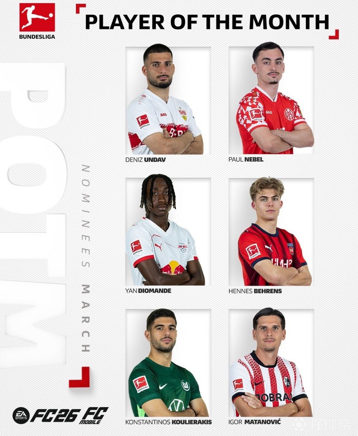 德甲3月最佳球员候选名单公布,昂达夫领衔,迪奥曼德在列。