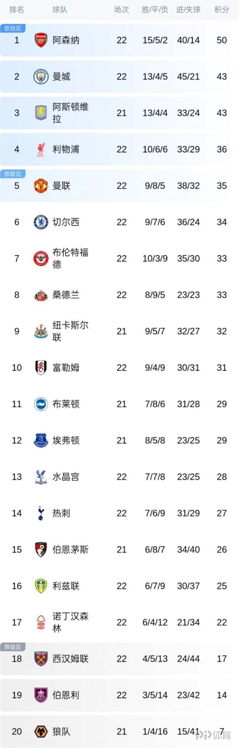 英超第22轮的7场比赛已经结束,积分榜的形势出现新的变化。