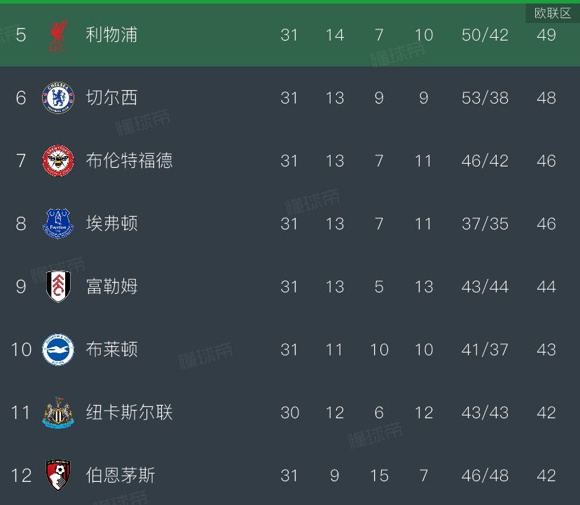 英超前31轮过后,利物浦积49分排名第五,切尔西48分第六,在他们身后的则是同积46分的布伦特福德和埃弗顿。此外如果本轮纽卡能够在主场拿下桑德兰,他们的积分也会来到45分。