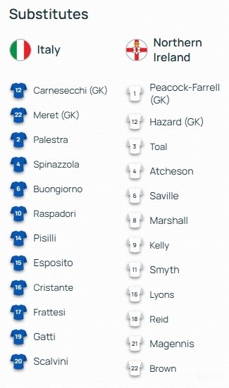 北京时间3月27日03:45,欧洲预选附加赛半决赛的一场较量。意大利对阵北爱尔兰。赛前,双方的阵容公布如下: