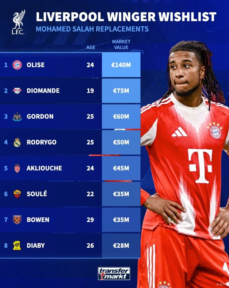 北京时间3月25日,在萨拉赫确定今夏离开利物浦的情况下,德转为红军列出了这位埃及球星的替代者,身价高达1.4亿欧元的奥利塞领衔,扬-迪奥曼德、安东尼-戈登以及罗德里戈在列。