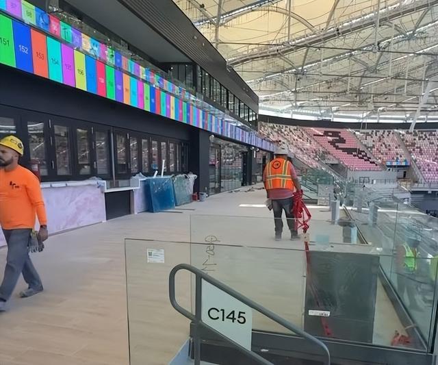 这座球场未来能容纳26700名观众。最骚气的还得是它的配色——清一色的粉红色座椅,完美复刻了迈阿密国际队的主场球衣颜色,远远望去满场都是“猛男粉”。