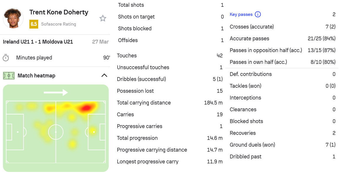 2.多赫蒂,爱尔兰U21 1-1 摩尔多瓦U21,首发打满全场。