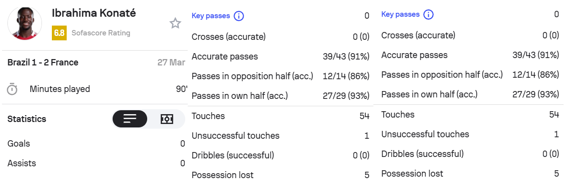 科纳特本场比赛完成3次拦截,1次解围,1次封堵射门,3次夺回球权。54次触球,43脚传球,传球成功率91%。