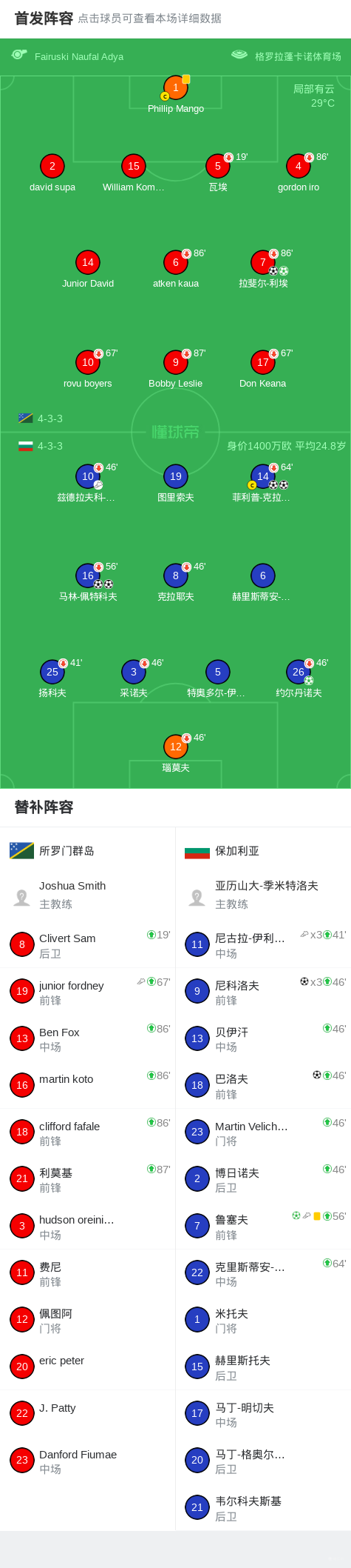 北京时间3月27日FIFA系列足球邀请赛 印度尼西亚赛区 第1轮,所罗门群岛对阵保加利亚。所罗门群岛拉斐尔-利埃梅开二度。保加利亚马林-佩特科夫梅开二度,菲利普-克拉采夫梅开二度,尼科洛夫帽子戏法,巴洛夫破门,约尔丹诺夫破门,鲁塞夫破门。最终比分所罗门群岛 2-10 保加利亚。