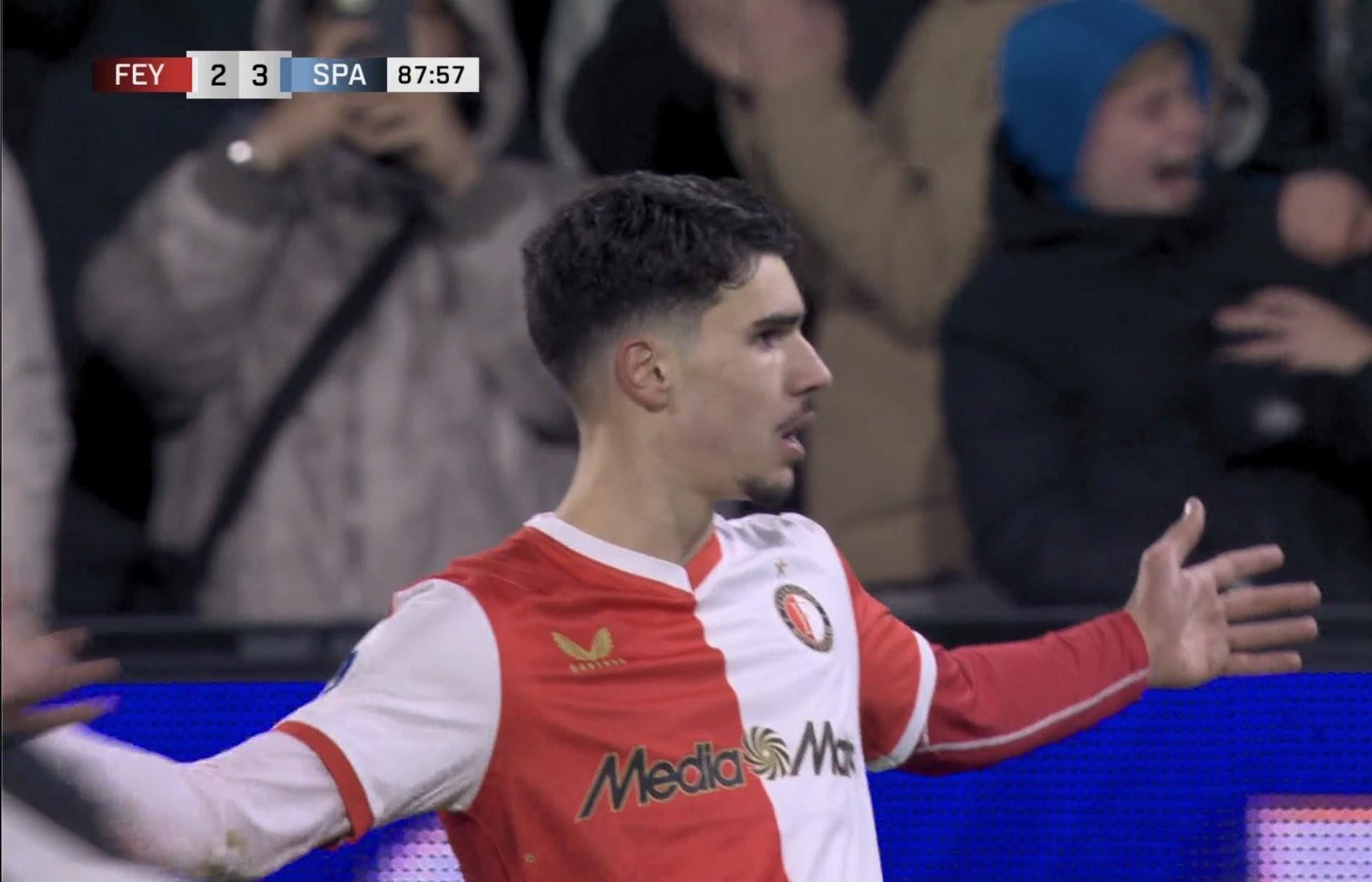 本场比赛费耶诺德71分钟过后就在主场1-3落后于鹿特丹斯巴达,而现年19岁的沙奎尔-范佩西则在第63分钟替补出场,第87分钟这位荷兰新星先是用一次后脚跟破门为费耶诺德扳回一城,仅仅1分钟过后他又在禁区内完成了一次精彩的倒钩破门,帮助费耶诺德扳平场上比分。遗憾的是,费耶诺德在第93分钟被鹿特丹斯巴达绝杀,最终主场3-4告负。