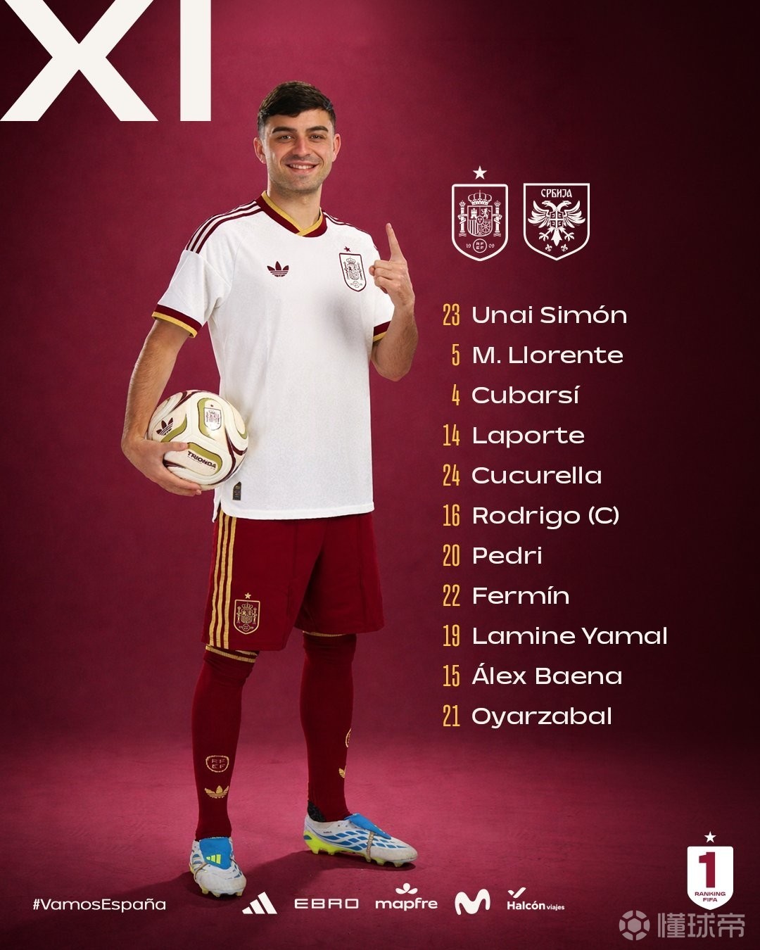 替补:1-拉亚、13-雷米罗、2-莫斯克拉、3-格里马尔多、6-赫伊森、7-费兰-托雷斯、8-索莱尔、9-博尔哈-伊格莱西亚斯、10-奥尔莫、11-皮诺、12-波罗、17-福尔纳尔斯、18-苏比门迪、25-穆尼奥斯、26-巴雷内切亚