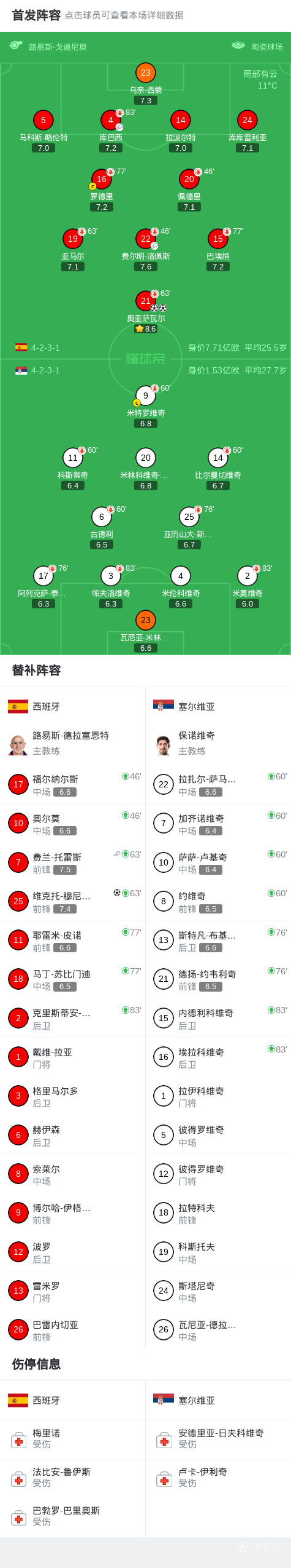 北京时间3月28日国际友谊赛,西班牙对阵塞尔维亚。上半场奥亚萨瓦尔梅开二度,费尔明破门被吹,下半场维克托-穆尼奥斯锁定胜局,费兰-托雷斯助攻+两连击造险。最终比分西班牙 3-0 塞尔维亚。