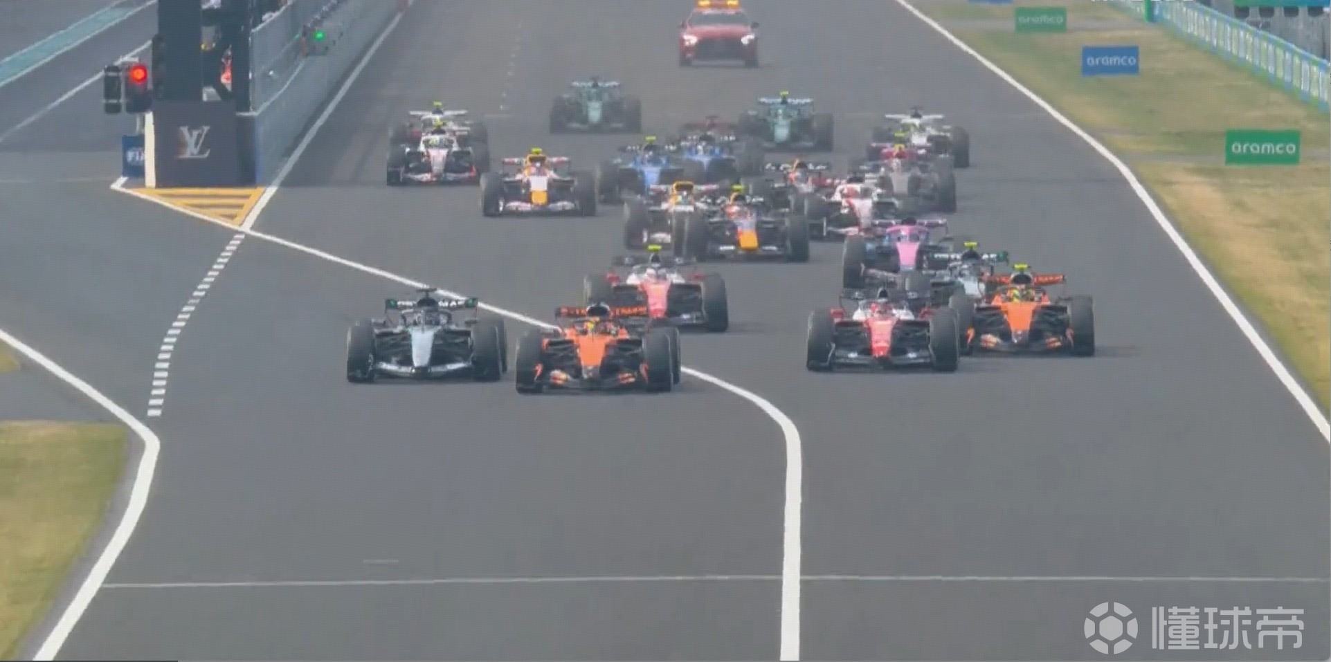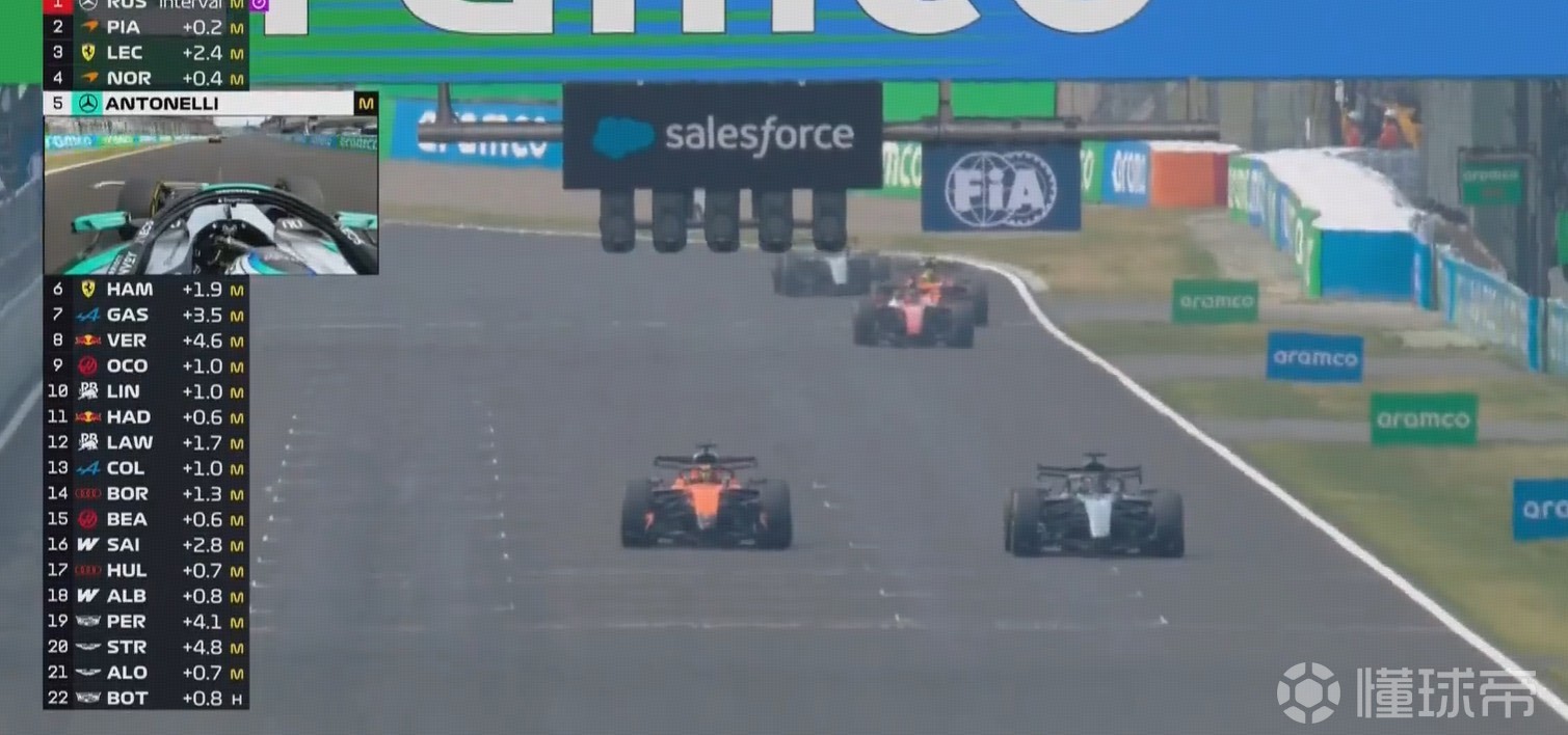 梅赛德斯起步不利跌至P4、P5,被两台迈凯伦和勒克莱尔超越,皮亚斯特里领先。