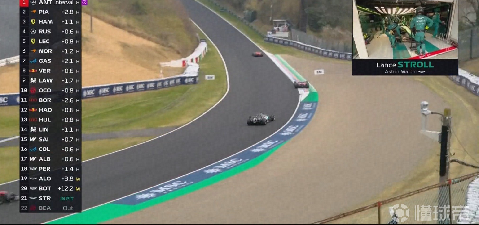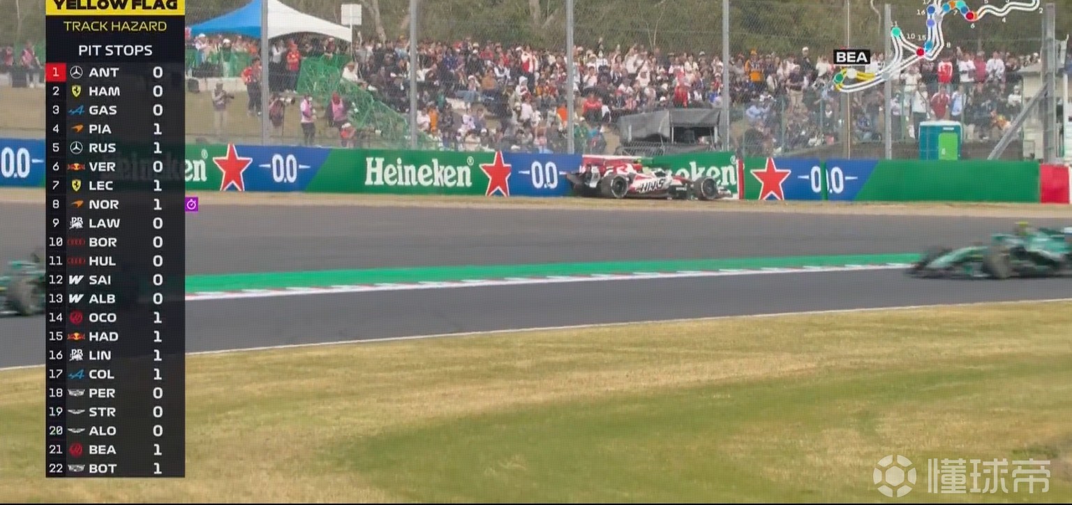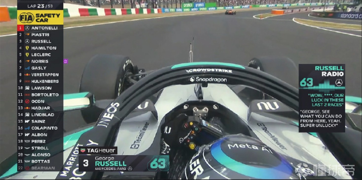 安东内利、汉密尔顿在安全车下伺机进站获得优势,出站分列第1、第4。拉塞尔无线电:我们运气真差。