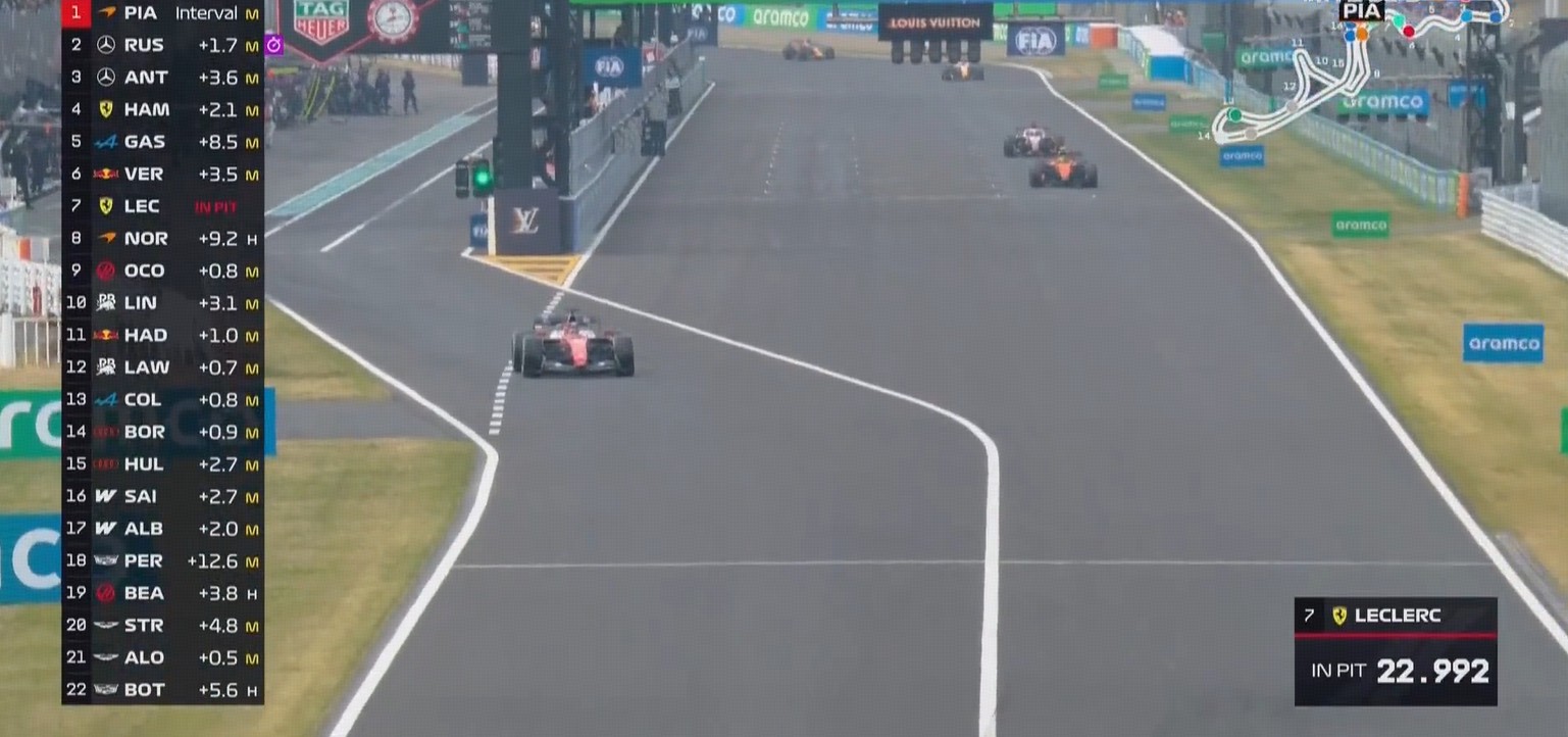 诺里斯被安东内利超越,两人和勒克莱尔被前二慢慢甩开。