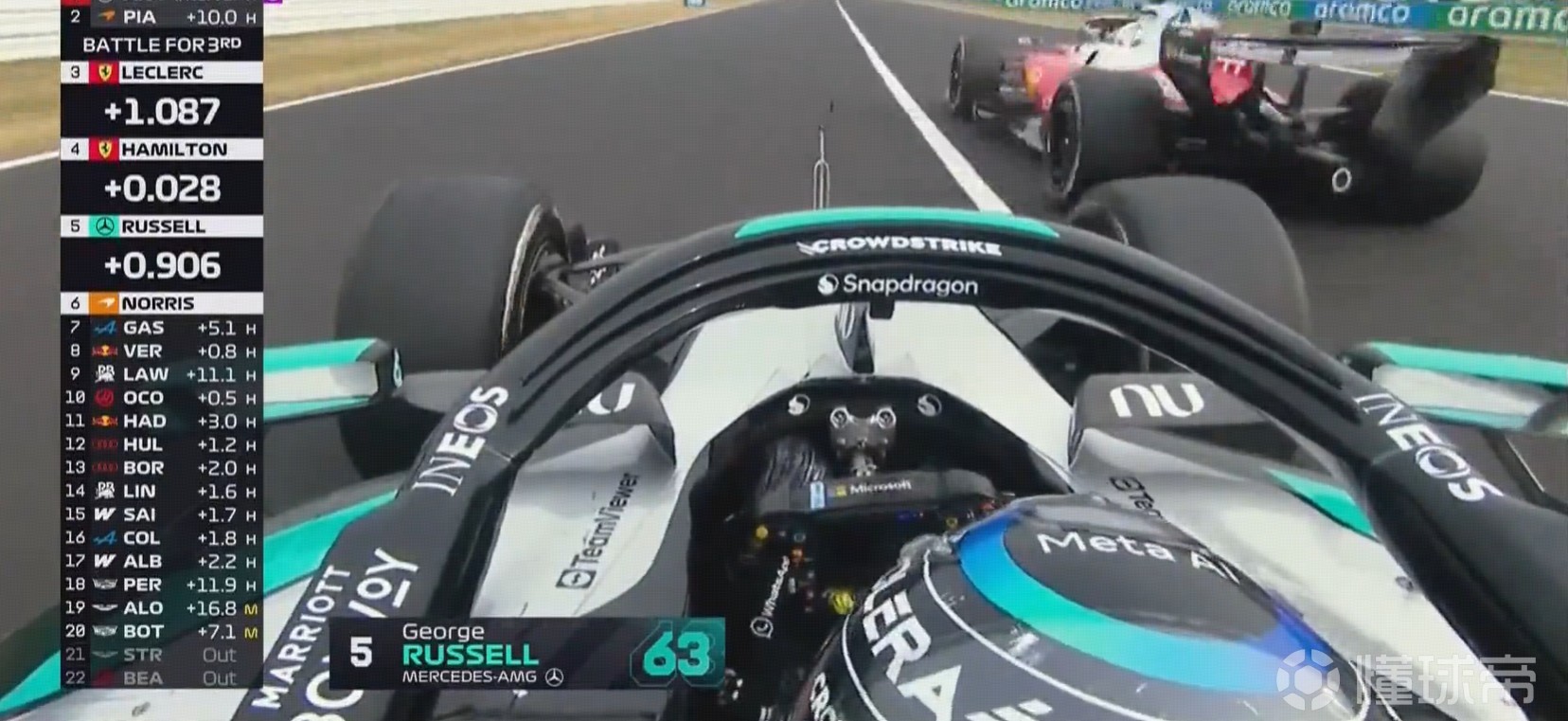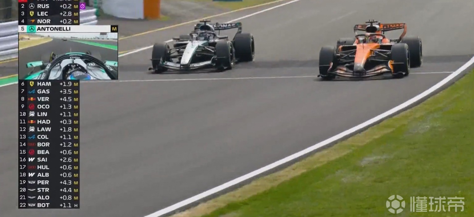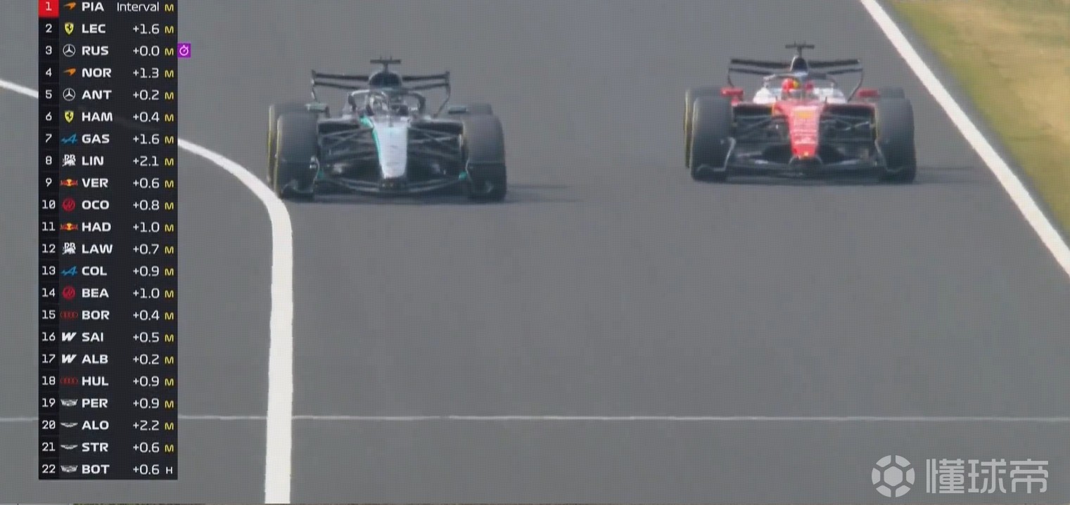 拉塞尔和皮亚斯特里用电策略不一,拉塞尔在S3杀进内线,皮亚斯特里在看台直路夺回领先。