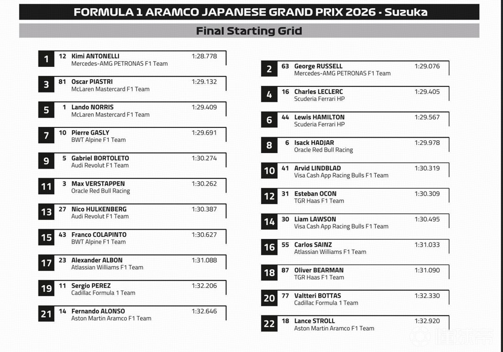 1-5:安东内利、皮亚斯特里、勒克莱尔、拉塞尔、诺里斯