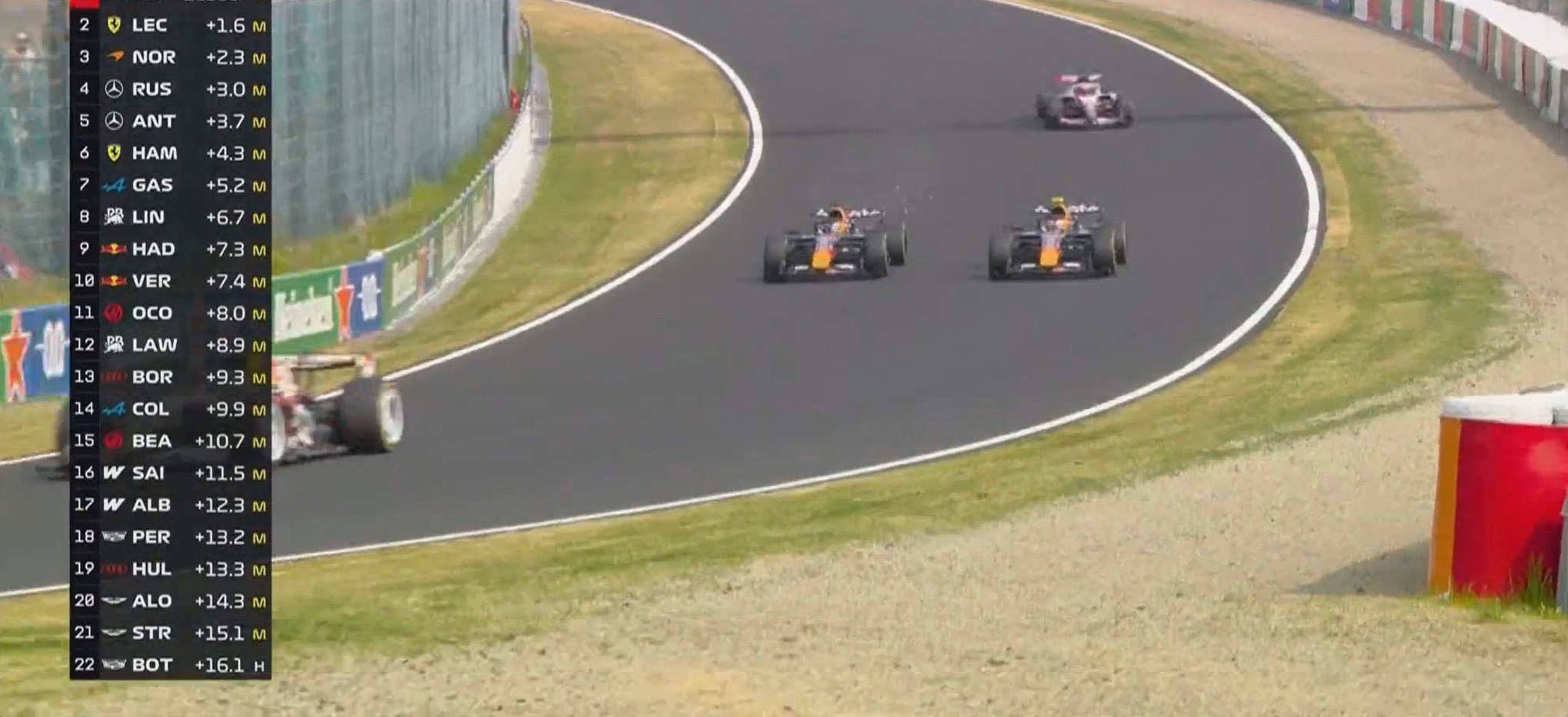 安东内利继续拉开,勒克莱尔在高速弯出人意料地超越拉塞尔。