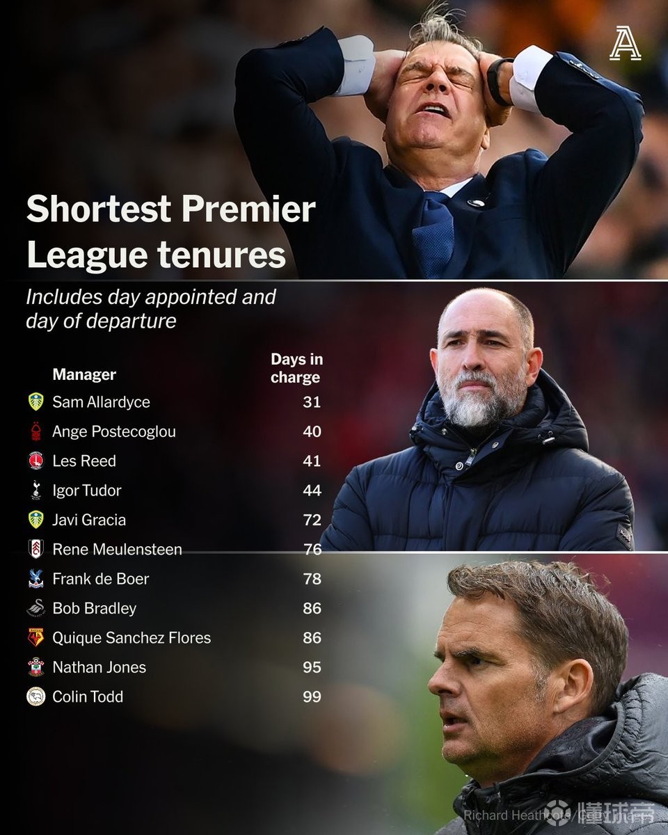 北京时间3月30日,在托特纳姆热刺官宣图多尔下课之后,The Athletic列出了英超历史最短命的11位主帅,执教热刺仅仅44天的图多尔位列第4位。