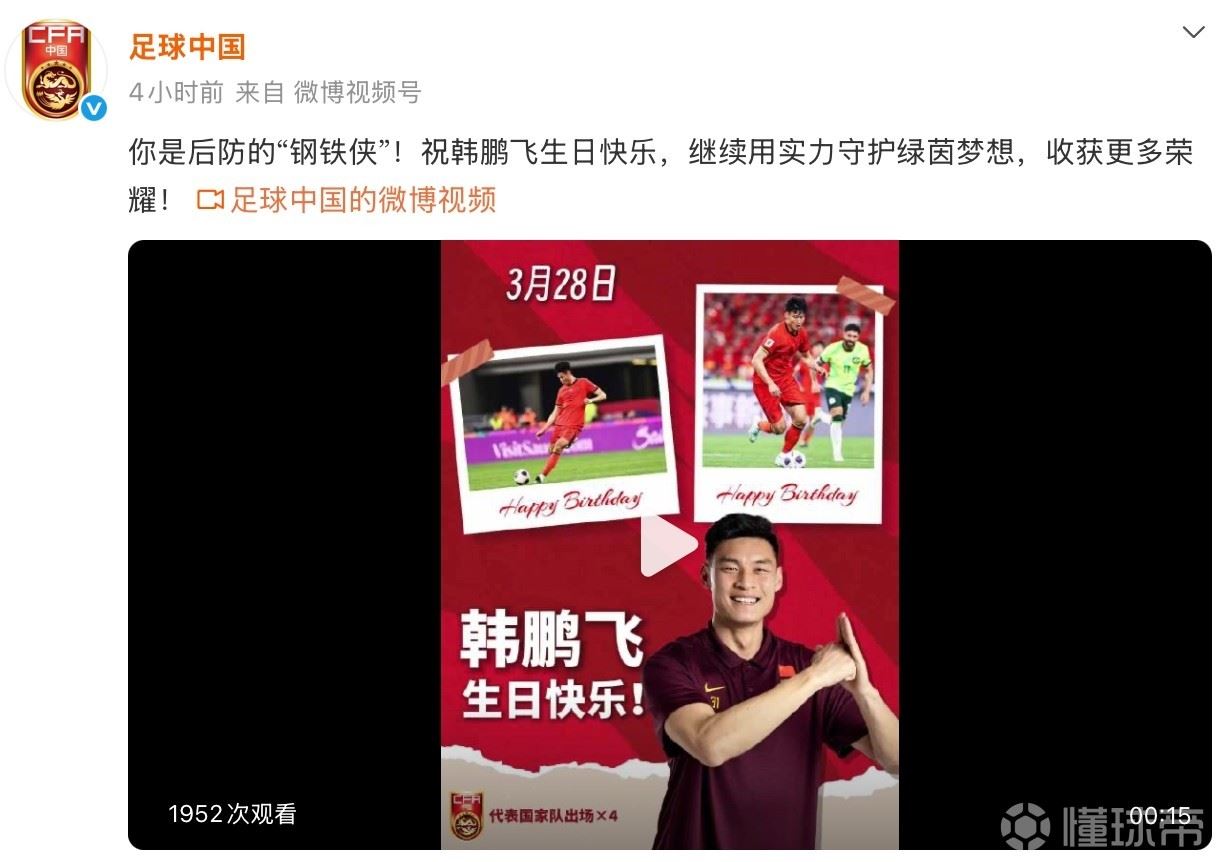 官方在今天上午发文表示:你是后防的“钢铁侠”!祝韩鹏飞生日快乐,继续用实力守护绿茵梦想,收获更多荣耀!