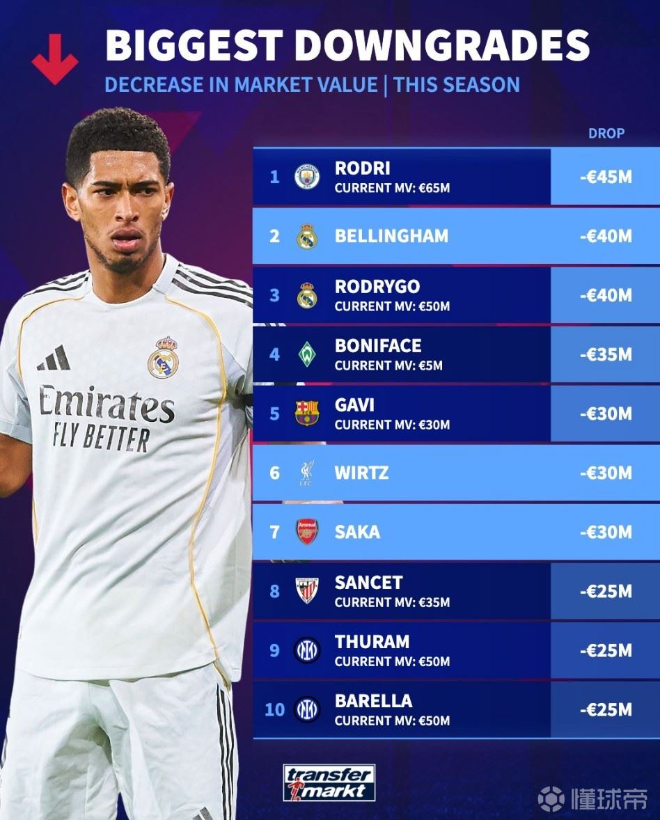 北京时间3月31日,德转列出了本赛季至今世界足坛身价跌幅最高的10名球员,罗德里下跌4500万欧元位列第一,贝林厄姆和罗德里戈下跌4000万欧元并列第二,加维、维尔茨、萨卡、马库斯-图拉姆以及巴雷拉上榜。