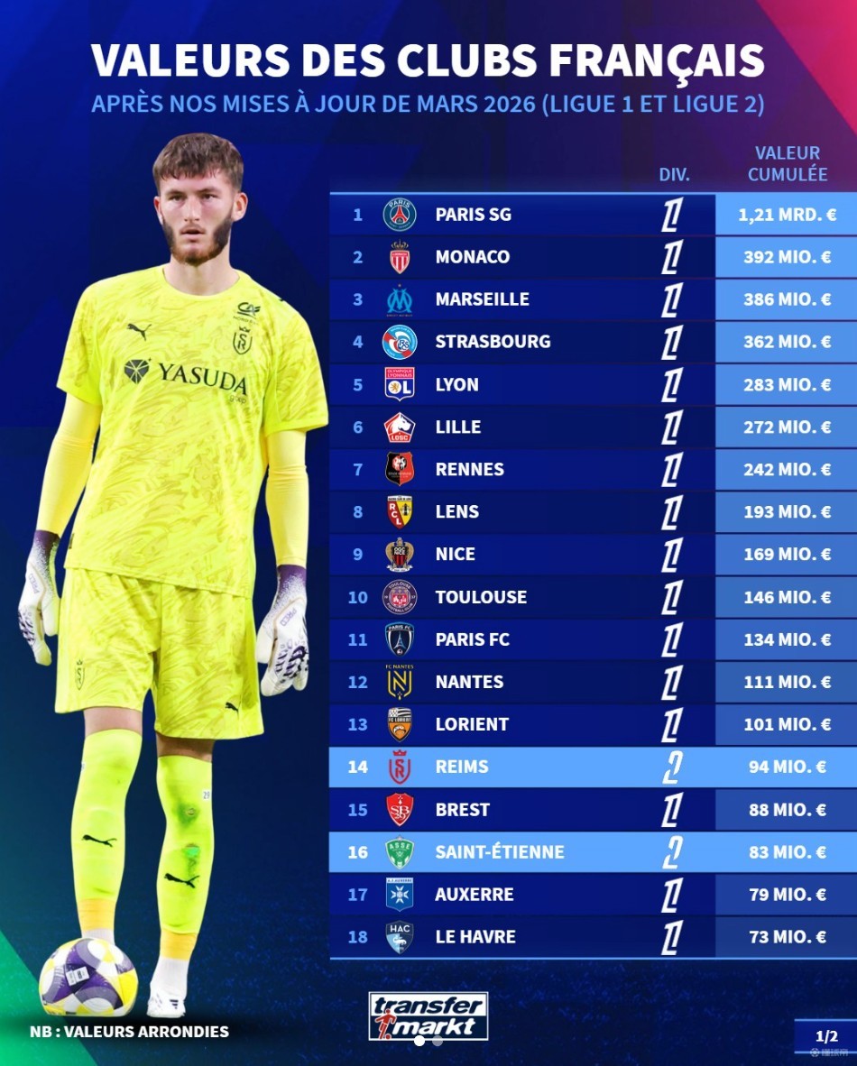 北京时间3月28日,德转列出了法甲+法乙合计36支球队最新的身价排行榜,巴黎圣日耳曼以12.1亿欧元断档第一,摩纳哥3.92亿欧元排名第二,马赛3.86亿欧元排名第三。