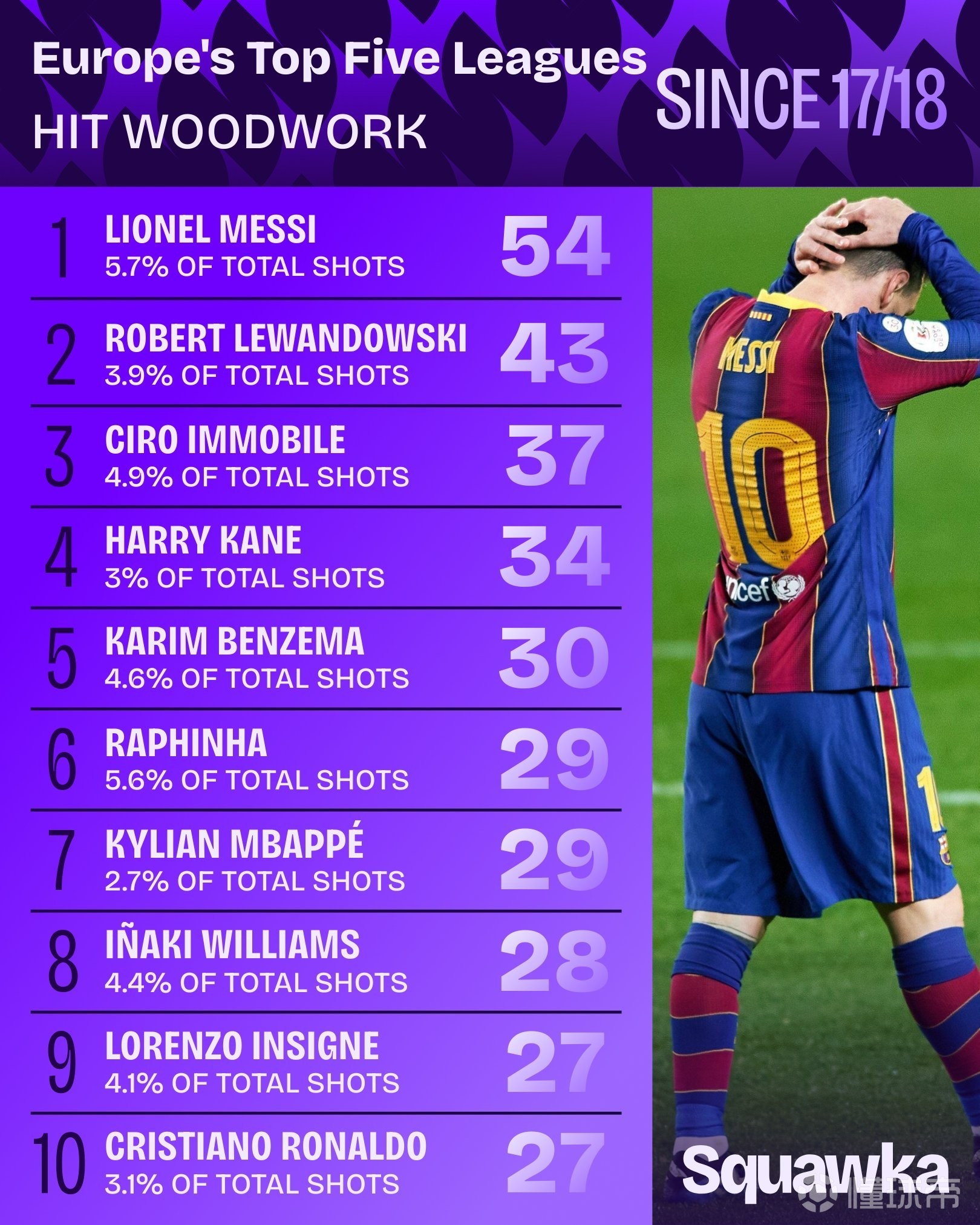 3月30日,数据媒体Squawka统计了自17-18赛季起,五大联赛中球员的中柱次数,梅西以54次居首,莱万多夫斯基43次第二。梅西的射门中柱占比5.7%同样也是中柱数前十的球员中最高的。