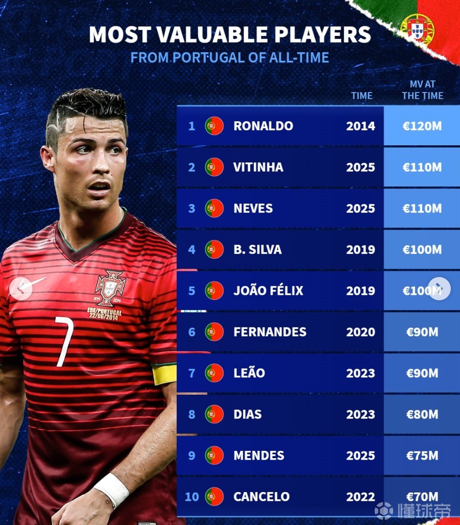 北京时间3月31日,德转列出了葡萄牙球员历史身价榜,C罗1.2亿欧元第一,维蒂尼亚和若昂-内维斯同以1.1亿欧元并列第二,伯纳多-席尔瓦、菲利克斯1亿欧元,布鲁诺-费尔南德斯9000万欧元第六。
