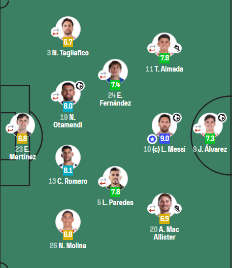 阿根廷此役打入5球,梅西一传一射,一次间接助攻。但其他两球也和梅西有关,得到点球之后,梅西将点球让给了奥塔门迪。而对手不慎打入的乌龙球,则是阿尔马达试图将球传给梅西时,钱达不慎解围失误,打入乌龙球。