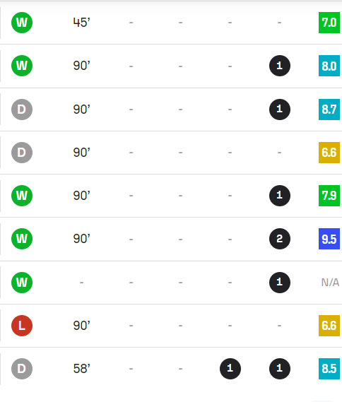 事实上,进入2026年以来,38岁的梅西状态丝毫没有下滑。近7场比赛,梅西4次得到8分以上的高分,只有3月12日对纳什维尔一战得分在7分以下,当时得到6.6分。