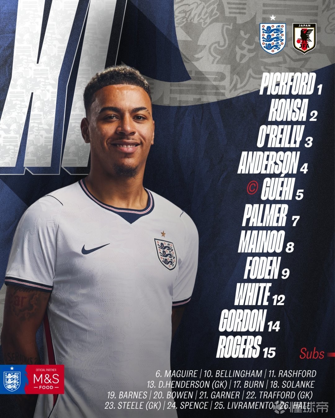 英格兰首发:1-皮克福德、12-本-怀特、2-孔萨、5-格伊、3-奥赖利、8-安德森、7-帕尔默、4-梅努、15-罗杰斯、14-戈登、9-福登
